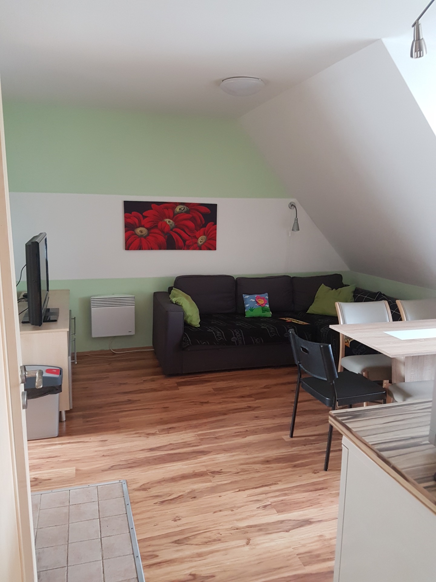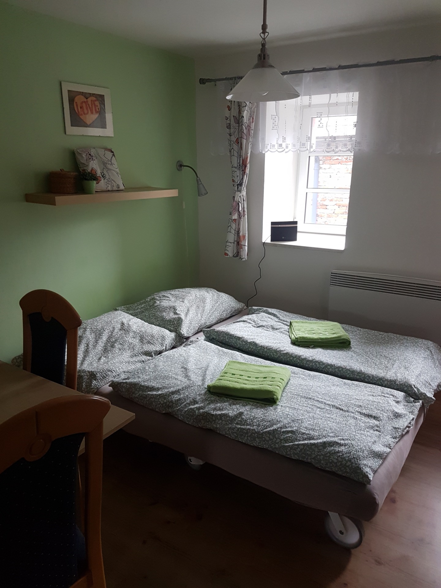 Nachází v přízemí objektu a je přístupný společnou chodbou. Nabízí ubytování až pro čtyři osoby ve společném prostoru (manželská postel a rozkládací dvoulůžko) společně s kuchyňskou linkou jídelním stolem a samostatnou koupelnou se sprchovým koutem. Prostor je vytápěn elektrickými topidly řízenými termostatem s možností využít krbovou vložku.